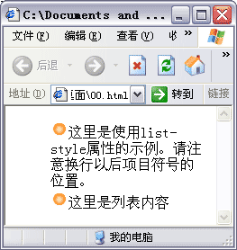 <li>这里是使用list-style属性的示例。请注意换行以后项目符号的位置。</li>