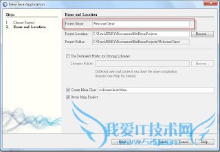 来到Name and Location的对话视窗,请填入Project Name为WelcomeClient,其他部分都使用原预设值,然后按Finish钮建立专案。