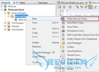 将滑鼠指标指向WelcomeClient专案小图示上,右击滑鼠带出脉络选单后,选取「Web Service Client...」子项目,