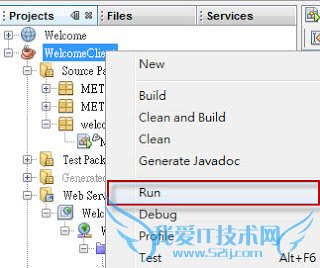 完成以上叁个步骤之后,请将滑鼠移到WelcomeClient专案,按滑鼠右键且选择「Run」项目来执行Main程式,