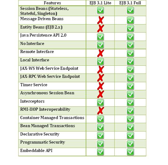 EJB3.1 与 EJB Lite的功能对比如下图。