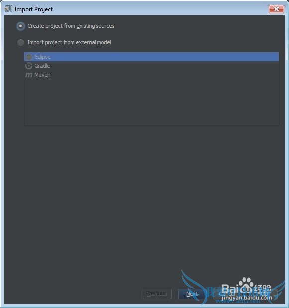 一旦源目录是已知的,IntelliJIDEA需要知道用户是否想要使用指定位置文件建立一个新项目,或者是否希望IntelliJ IDEA采用一个给定的项目模型(即Eclipse, Maven, 或Gradle),之后才能按照自动化的方式进行。