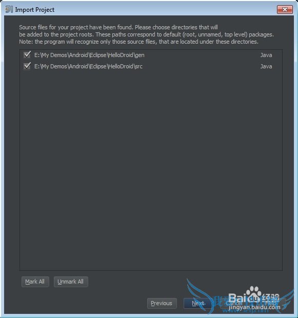 因为在这种情况下没有已知的项目模型在运行,所以IntelliJ IDEA的向导要经过不少的步骤才能在磁盘上找到匹配的模型和Android项目的要求。