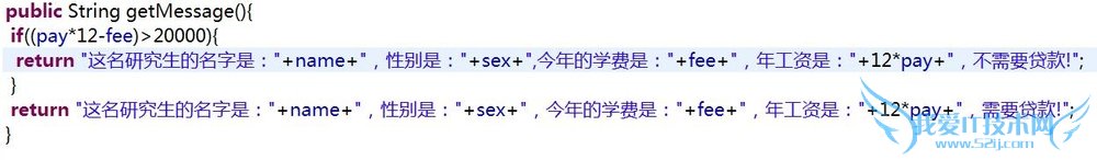 return "这名研究生的名字是:"+name+",性别是:"+sex+",今年的学费是:"+fee+",年工资是:"+12*pay+",需要贷款!";