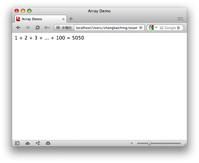 <html><head><title>Array Demo</title><script>function run() {var a = [];var i;for (i = 1; i <101; i++) {a.push(i);}varsum=0;for (i in a) {sum += a[i];}vard=document.getElementById("display");d.innerHTML="1 + 2 + 3 + ... + 100 = "+ sum;}</script></head><bodyonload="run()"><divid="display"></div></body></html>