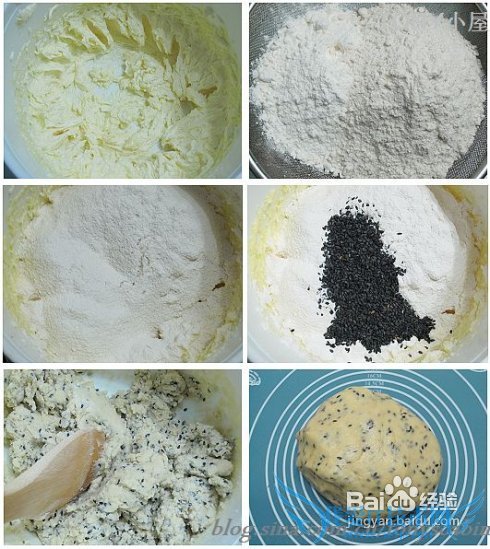 原料:黄油60克 白糖40克 盐2克 鸡蛋一个 熟黑芝麻两勺 低筋面粉125克