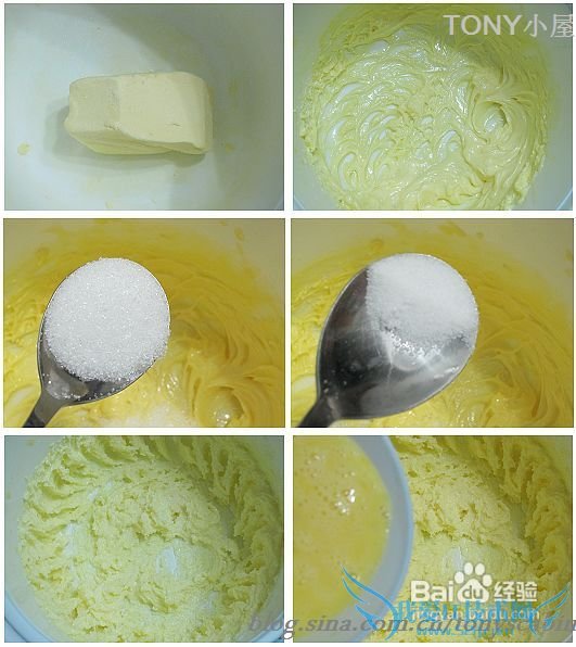 1.黄油室温软化后用电动打蛋器打散;