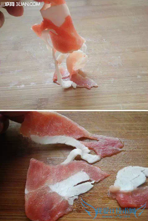 假羊肉的肥肉和瘦肉是分开的,真羊肉的肥肉和瘦肉相连且纹路清晰。把羊肉片化冻,化冻后,红肉和白肉轻轻一碰就分开了,而真羊肉即使用手撕,红白肉都是相连的。