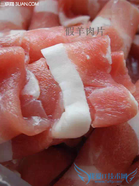 这些羊肉中,往往白色部分是真的羊油脂,而瘦肉就是其它替代肉了。通常做法是把替代肉在羊油中浸泡,再掺入一部分羊肉的油脂,压制成肉柱冷冻,然后上刨片机刨出假羊肉;但更隐秘的方法是把羊油脂通过胶水,粘在替代肉上,或用针直接把油脂注射在替代肉里,在加入红色色素和羊肉香精,这样看上去就真假难辨了。