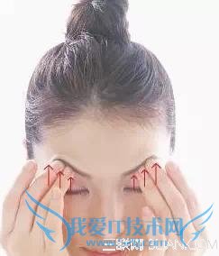 3、下巴朝下,将中指和无名指的指肚儿放在眉骨下,再突地一下将眼皮往上拉。