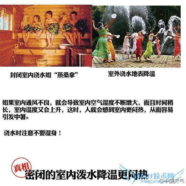 很多人喜欢在室内泼水降温,这种方法的确会带走一些热量,使室内温度有所下降。但如果室内通风不良,就会导致室内空气湿度不断增大,而且时间稍长,室内温度又会上升,这时,人就会感到室内更闷热,从而容易引发中暑。