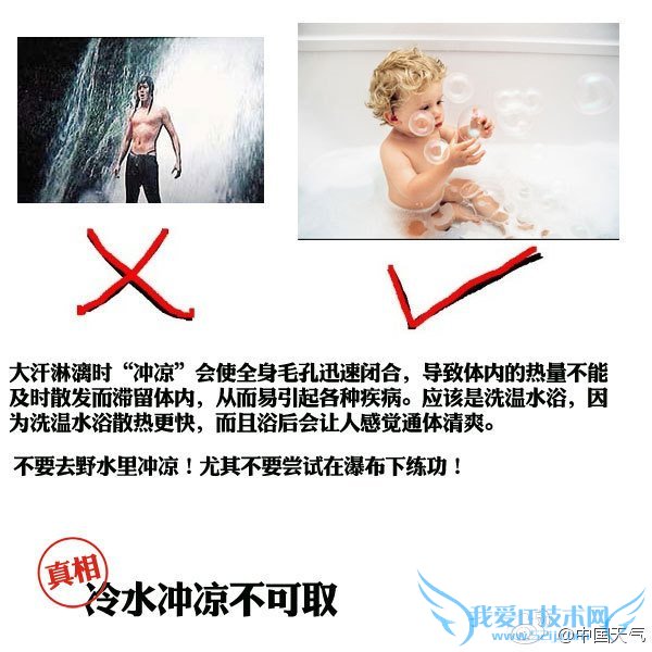 很多人认为用冷水“冲凉”能起到降温的作用。而事实上,大汗淋漓时“冲凉”会使全身毛孔迅速闭合,导致体内的热量不能及时散发而滞留体内,从而易引起各种疾病。