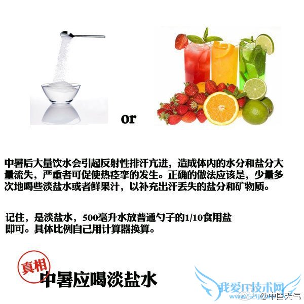 很多人中暑后会喝大量的白开水。专家提醒,中暑后大量饮水会引起反射性排汗亢进,造成体内的水分和盐分大量流失,严重者可促使热痉挛的发生。正确的做法应该是,少量多次地喝些淡盐水或者鲜果汁,以补充出汗丢失的盐分和矿物质。
