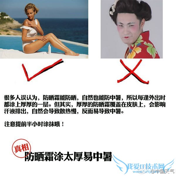 很多人误认为,防晒霜能防晒,自然也能防中暑,所以每逢外出时都涂上厚厚的一层。其实,这种做法不仅不能防暑,反而会导致中暑。厚厚的防晒霜覆盖在皮肤上,会影响汗液排出,自然会导致散热慢。