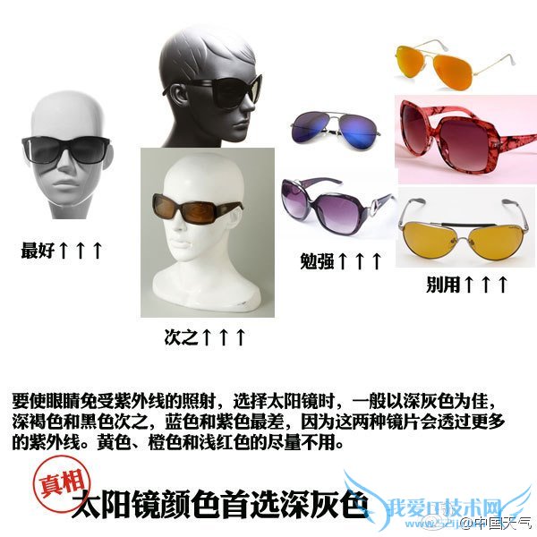 要使眼睛免受紫外线的照射,选择太阳镜时,一般以深灰色为佳,深褐色和黑色次之,蓝色和紫色最差,因为这两种镜片会透过更多的紫外线。黄色、橙色和浅红色的尽量不用。