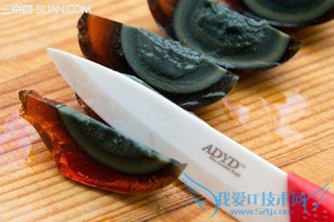 3. 用温热的刀背切皮蛋,蛋黄保证不会粘了。值得注意的是,为了将皮蛋切的漂亮,切几刀后需要再次将开水浇在刀背上。