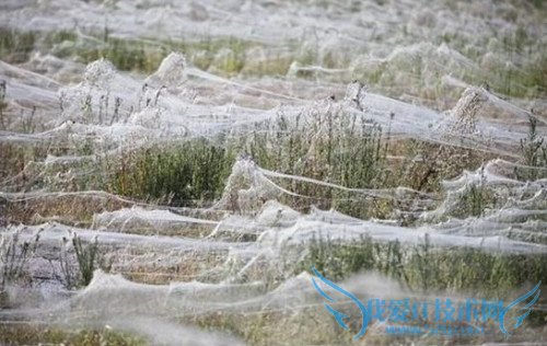 澳大利亚新南威尔士州南部高原地区近日下了一场怪异的“蜘蛛雨”,数以百万计的小蜘蛛从天而降,好似一场倾盆而下的大雨。地面瞬间爬满了无数小蜘蛛,而且还覆盖了一层白茫茫的蜘蛛网,像是铺了一层薄薄的蛛丝地毯。