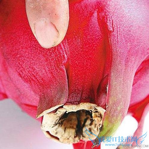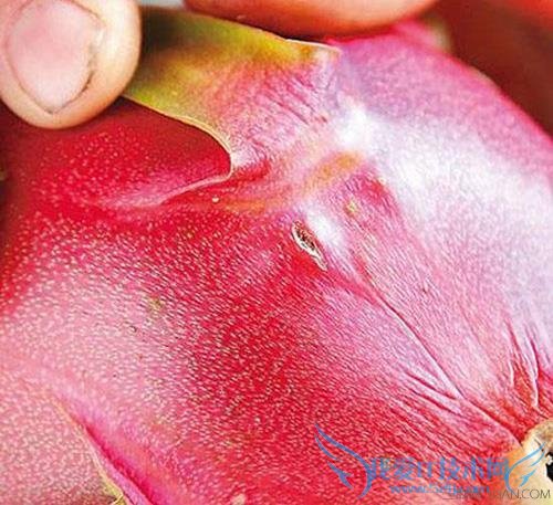 3、火龙果果实如果被果实蝇叮过,其果肉里面就会长虫且开始腐烂,挑选时可以检查其外表,表皮如果有凸凸的一粒粒、像青春痘一样的,可能就是果实蝇叮过的痕迹。如图,这是有伤口的,不宜选购。