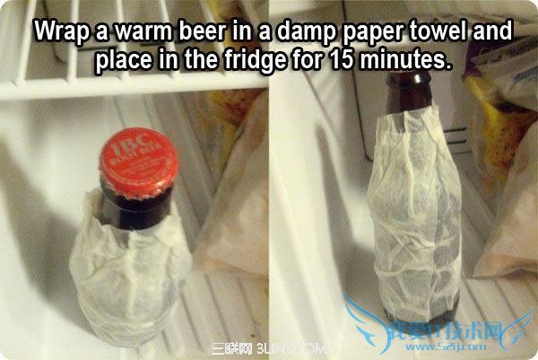 ▼8. 冰镇啤酒喝完了,现冻又需要时间, 怎么办?啤酒瓶裹上湿纸巾放入冰箱可快速降温哦!