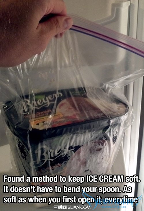 ▼4. 刚从冷藏室里拿出来的冰淇淋总是硬梆梆的,但是只要你在外面套上一个保鲜袋,问题就解决了哦~ (这对于吃货的我来说简直太实用了!)