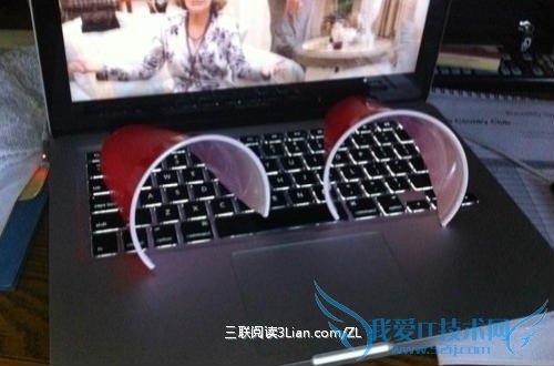 8、笔记本立体声不够震撼?找两个纸杯裁成两半这样放好,享受心理作用程度的震撼立体声吧(拢音),别忘了把杯底去了。