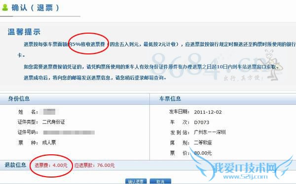 旅客要求退票,在票面乘车站办理时,应于票面指定的乘车日期开车前2小时办理。异地票在原购票地办理时,应于票面制定乘车日期开车前6小时办理。提前2小时——2天办理退票时,按票面票价退款50%;提前3——14天办理退票时,按票面票价退款70%;提前15天以上办理退票时,按票面票价退款100%,另核收手续费15港元。广九直通车退票费达票价50% 其他列车5%。