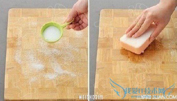 ▌先用洗洁精和清水把案板清洗干净,然后在案板上撒一勺盐,用洗碗海绵蘸一点点水后,反复擦拭案板的表面,然后用冷水冲洗干净。再将白醋和水以1:2的比例调好后倒入喷壶中,喷在案板的表面,然后放到通风的地方,自然风干即可。