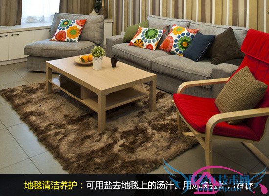 地毯污渍一般都用吸尘器进行清洁,但是对于一些比较特殊的污渍则可以采用一些小技巧,效果更佳。对于地毯上的汤汁,可以用毛巾或干布吸干其水分后,在污渍处撒些食盐,吸掉汤汁,最后用吸尘器吸走食盐即可。