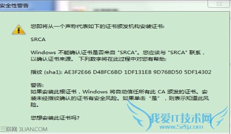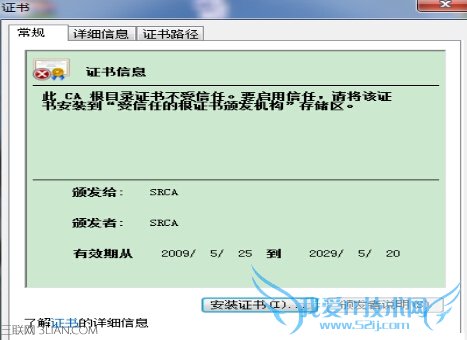 步骤二、下载的证书文件是压缩包,您需对文件进行解压(电脑中需安装压缩工具),解压后得到srca.cer文件,找到里面的crca.cer文件,双击打开,选择将所有的证书放入下列存储,点击浏览,点击“安装证书”,然后选择受信任的根证书颁发机构,点确定,最后跳出安全性警告,点击是。