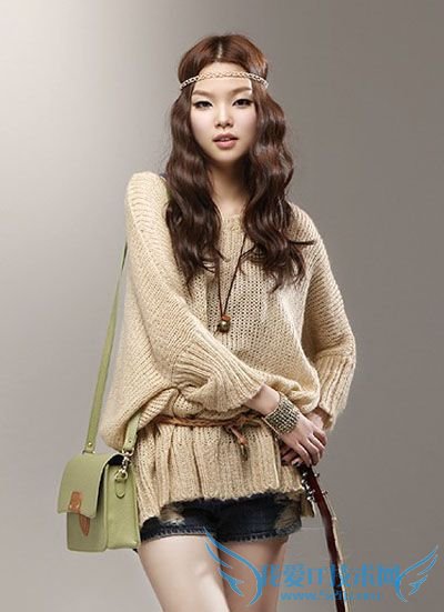 甜美搭配2:丝带头饰 + 宽版针织衫 + 牛仔短裤