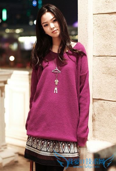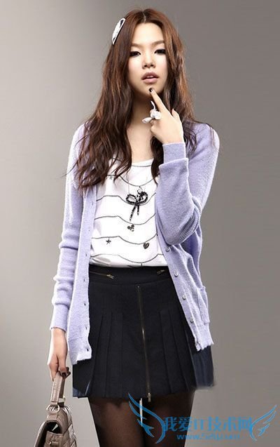 甜美搭配3:淡紫色针织衫 + 圆领T恤 + 拉链百褶裙