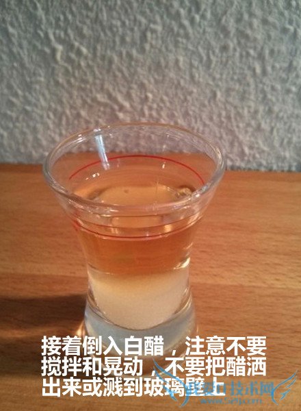 接着倒入白醋,注意不要搅拌和晃动,不要把醋洒出来或溅到玻璃壁上