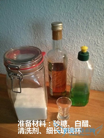 准备材料:砂糖、白醋、清洗剂、细长玻璃杯
