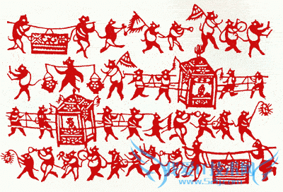 “老鼠嫁女”、“老鼠娶亲”的年画和剪纸在我国民间视为“吉祥物”,过年过节时贴在墙上和窗户上。四川绵竹印制的《老鼠嫁女》年画,表现一伙老鼠掮旗打伞,敲锣吹喇叭,抬着花轿迎亲。骑在癞蛤蟆背上的是“新郎”,头戴清朝的官帽,手摇折扇,双目注视着一只大金箱,显出一副贪婪的样子。正当这伙丑类大摇大摆,招摇过市之时,等待它们的却是一头大黄猫。前面鸣锣开道的一对鼠兄鼠弟,其中之一已被猫的利爪抓住,另一只则咬在猫的嘴上。此时,坐在花轿里的“新娘”,自知末日来临、泪流满面。这幅年画反映了人民鲜明的爱憎。