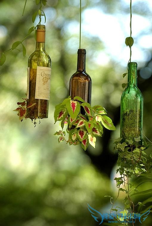 红酒的瓶子本身质量很好,非常适合做盆栽的容器。既能让自己家多一抹绿,又能像风铃一样,带来悦耳的声音。