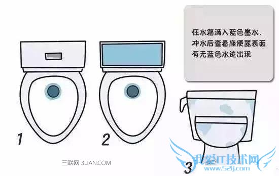 测试方法:在座便器水箱内滴入蓝墨水,搅匀后看座便器出水处有无蓝色水流出,如有则说明座便器有漏水的地方。
