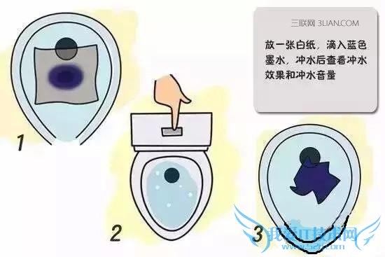 测试方法:在座便器内放入一张白纸,滴入几滴蓝墨水,待纸张染成蓝色后冲水,看坐便器是否冲水彻底,同时听冲水静音效果是否良好。3lian.com