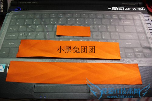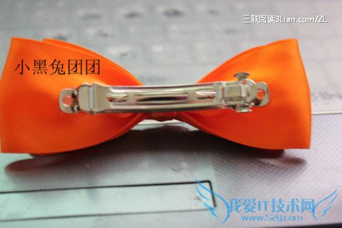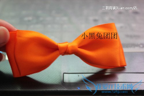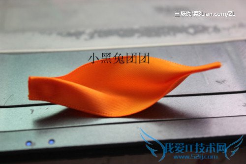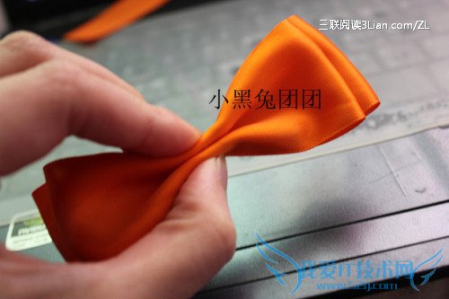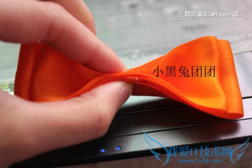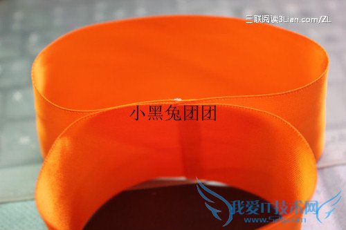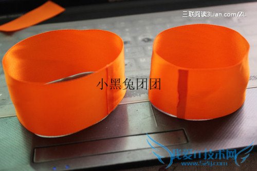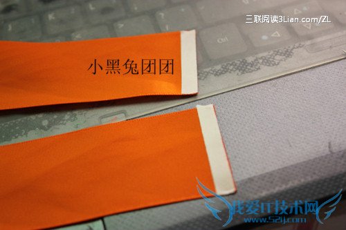 2、在38MM的丝带一端粘上双面胶。把丝带暂时固定一下。