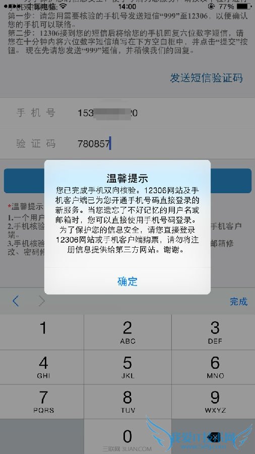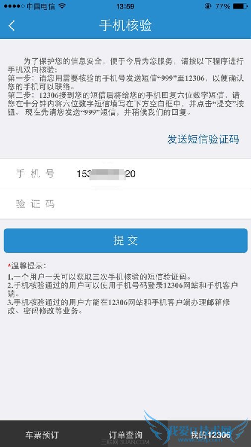 这个时候用手机向12306发送短信“999”。随后12306会回复一个6位数字的短信到该手机上。新用户需在10分钟之内,输入这6位数字的验证码,从而登录12306网站。