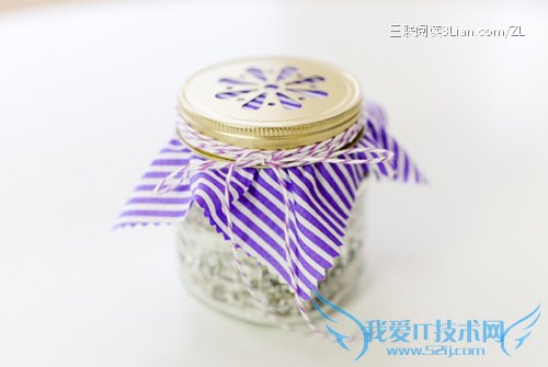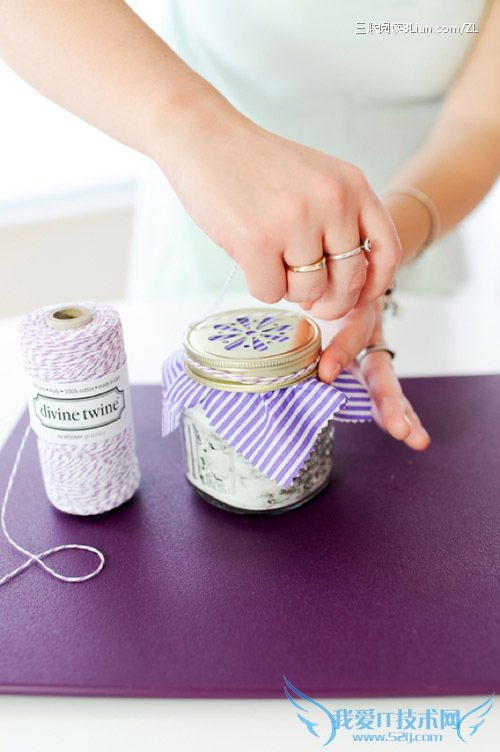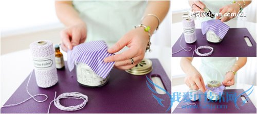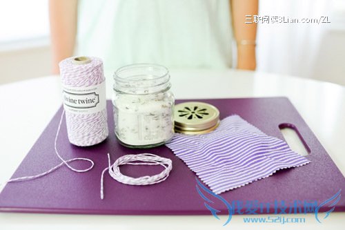 将布料盖在瓶口上并洒上一滴薰衣草精油,将盖子拧紧最后缠上麻绳。
