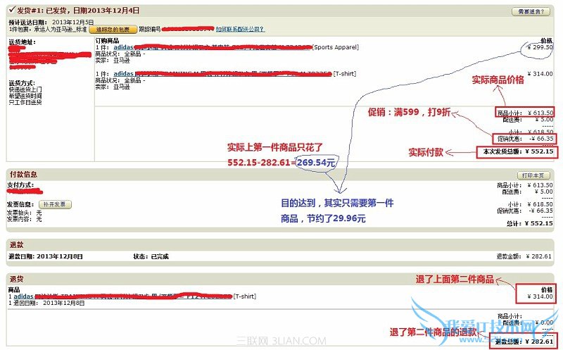 收到货后再将凑数的第二件退掉,之后算下来想要买的这件T恤只花了135元,节约了43元