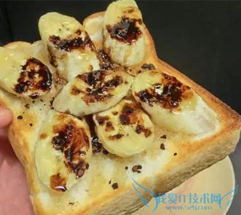 香蕉切片后铺满土司后再撒上两勺即溶咖啡,放进烤箱烤个 2 分钟左右即可大功告成。