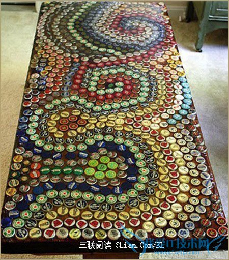 啤酒盖艺术桌:废旧的桌子,可以再上面贴上这种啤酒盖子,整体看上去就相当的有艺术了。