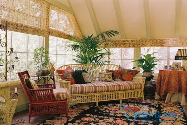 充满华丽的民族特色的东南亚风格阳台,夸张伸展的植物叶子,藤条编织帘子都给人热带风景的享受。