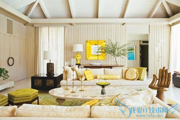奶白色的背景下,用奶白色的沙发,提供亮黄色、芥末绿两种颜色的着落点,起到了很好的调和过渡作用。