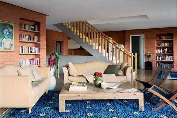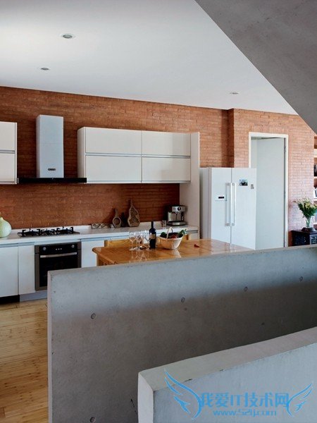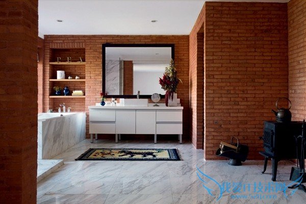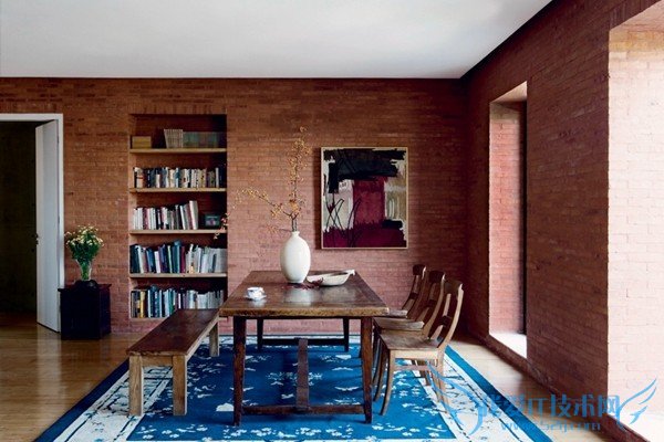 山中的房子在设计上充分考虑到供暖效果, 空调、地暖,还有壁炉,利用红砖特点垒砌 的壁炉形式独特,设计师安东在红砖前的勾 缝特别选用了和砖色相近的颜色。