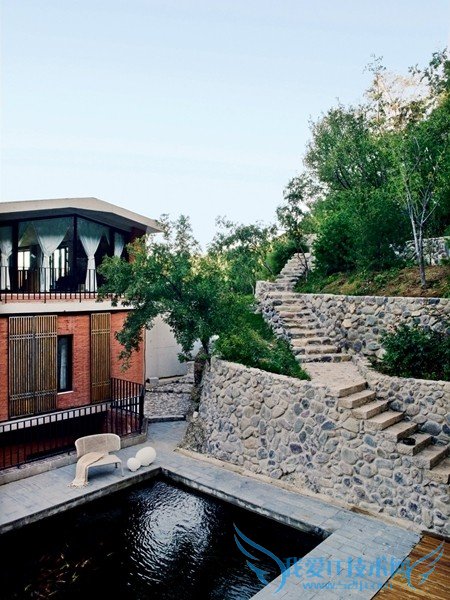 因为是在陡峭的地势上建造,这片天地的地面空间实在有限,建筑难 度不小。房子的形状依照山体来设计,面积是从底层最小,越往上层走平 面面积也越大,登上中层庭院才可以看到建筑上半部的模样。而随着山势 建起来的院墙,是用鹅卵石垒起来的,鹅卵石是就地取材。山下是门头沟 干涸的永定河,河床下面有很多的鹅卵石。这是大自然的馈赠,河里的石块,经过长时期水的缓慢冲刷和自身的相互滚动,最终形成了今天的鹅卵 石。来自浙江山区的吴卫军,对鹅卵石非常熟悉,也很有感情,更好地利 用了本地资源。 现在的房子是慢慢摸索着建成的。吴卫军曾经作为外部审计师服务 于中国银行10年,在北京总行的办公楼正是著名建筑师贝聿铭设计的,在 这座大楼的设计上,贝聿铭就提倡把“室内空间让给室外空间”,多吸 纳和包容外部的环境和行人。在建造房子的过程中,吴卫军学习了贝聿铭 的理念,尽可能地把室内外结合在一起,这样有了面向花园的开放客厅, 卧室层也可以直接通往有池塘的室外。在这所房子的设计过程中,他们总 共见过3位设计师。一位是国内的新生代设计师、一位是意大利设计师, 一位是最终合作的、居住在北京的委内瑞拉设计师安东。他们的设计理念 各有千秋,但只有安东最合房主的心意。“他的年纪也足够大,能够坚持 和我说不。”吴先生倒是不掩饰反而欣赏设计师给予的反对意见,“我觉 得国内这位年轻设计师的建议比较空洞、做作,不符合我实实在在的生活 要求。意大利设计师建议的欧式奢华风格并不适合这座房子,也不适合我 们。我们最终选择与安东合作,他设计的院子入口就打动了我,潦潦几 笔,就奠定了这所房子简洁的风格。”