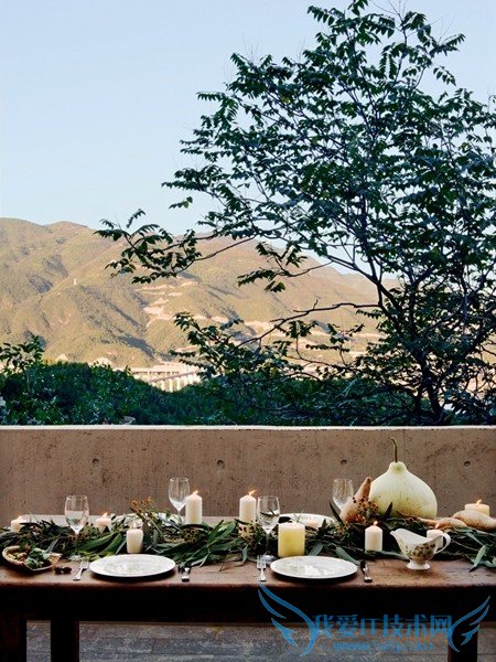 红砖和水泥构建的房屋,简洁的木质窗栅,给建筑提供了另一种质感。鱼塘边, 一条上山的小路,是用鹅卵石垒砌。永定河的大鹅卵石,是自然的馈赠。沿着石 阶上山,是两人周末最享受的休闲方式。鱼塘边Foscarini Gregg户外球形地灯来 自Domus Tiandi家天地,户外椅上的毛毯来自博放Profound。对页:从露台上可 以瞭望远处大山,山脚下是永定河,大山的背后就是北京城区。北方的秋天是果 实满山的季节,用山谷里的野菊花装点的餐桌上,葫芦、秋枣,都是自家园子里 的收获。木桌上的诺娃餐具来自德国唯宝Villeroy & Boch。