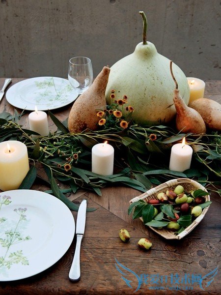 一张长长的餐桌,用来自大自然的馈赠装点起来,摆上精致的骨瓷餐盘、剔透的水晶酒杯,一盏 盏幽微的烛光带来深秋的暖意,温馨的家宴即将登场。诺娃餐具来自德国唯宝Villeroy & Boch。