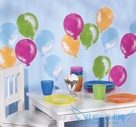 清淡的蓝色墙面,搭配四种缤纷色彩的气球墙贴,以及糖果色的餐具,让整个空间呈现出一种新鲜的甜蜜感。